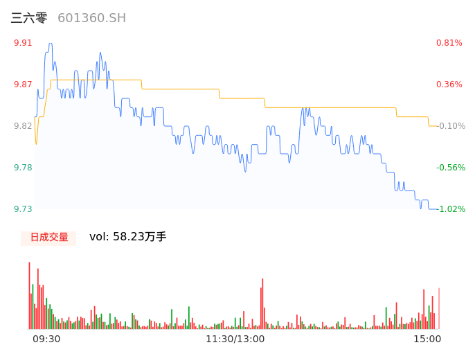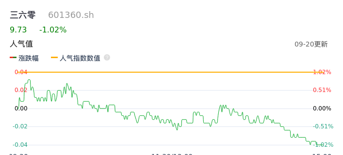 09月20日,三六零收报9.73,股价涨幅-1.02%,成交金额5.72亿元,换手率0.81%。