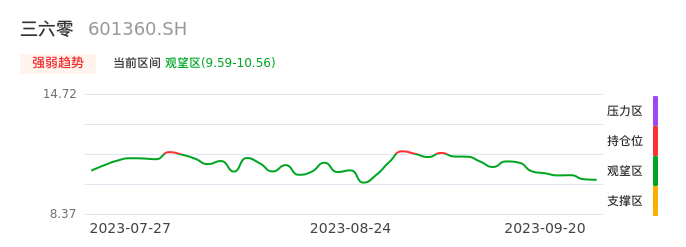 我们来看一下该股的九方特色指标强弱趋势的情况:三六零自09月05日从持仓区下穿到观望区,股价近期持续走弱。短期已经进入空头行情,且下跌动能仍未衰竭。建议继续谨慎观望。
