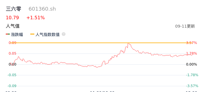09月11日,三六零收报10.79,股价涨幅1.51%,成交金额10.57亿元,换手率1.37%。