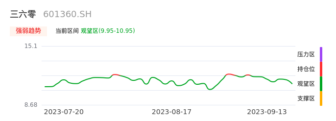 我们来看一下该股的九方特色指标强弱趋势的情况:三六零自09月05日从持仓区下穿到观望区,股价近期持续走弱。短期已经进入空头行情,且下跌动能仍未衰竭。建议继续谨慎观望。