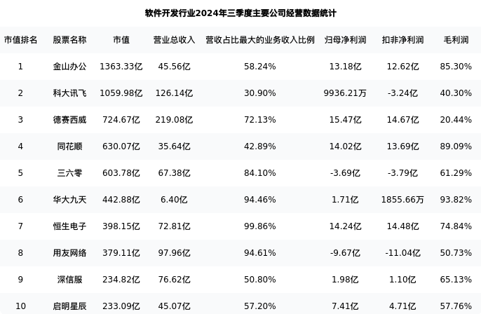 三六零最新报告期数据为三季度,下表汇总了软件开发行业内市值靠前的公司三季度主要经营数据
