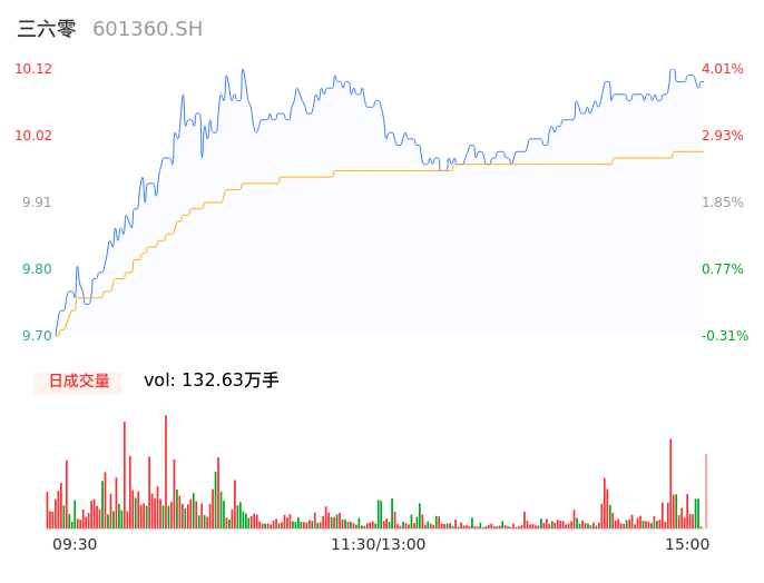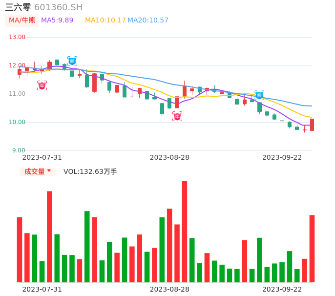 09月22日,三六零收报10.11,股价涨幅3.91%,成交金额13.25亿元,换手率1.86%。