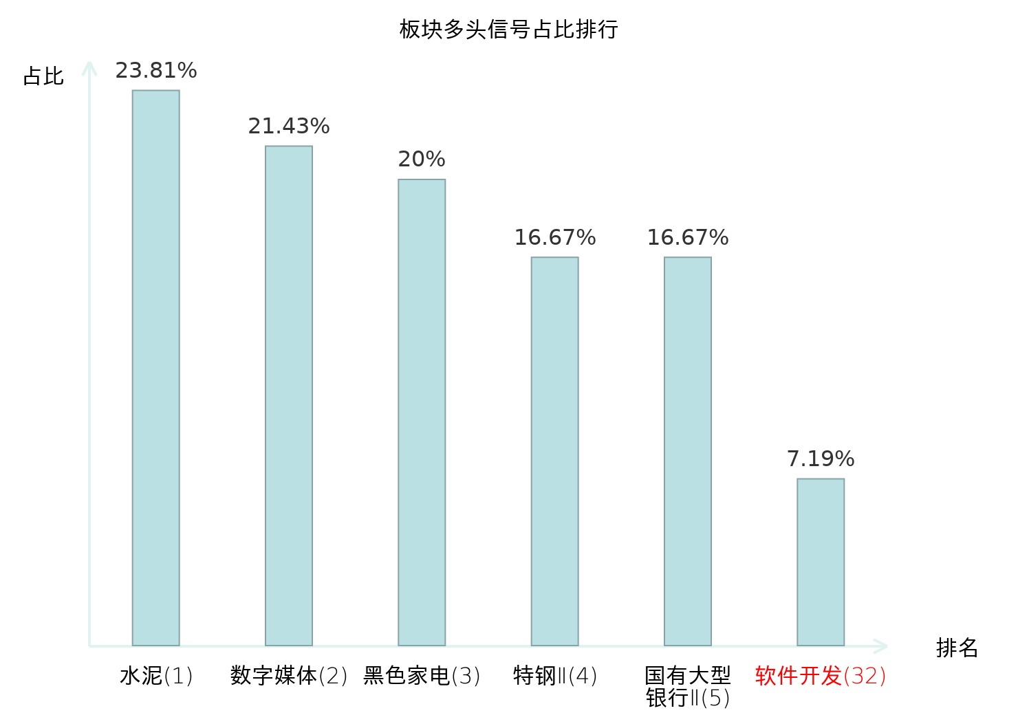 全市场所有行业板块中主力多头信号占比排名中,水泥板块位居第一。焦炭Ⅱ板块名次提升最快,较昨日上升115位。