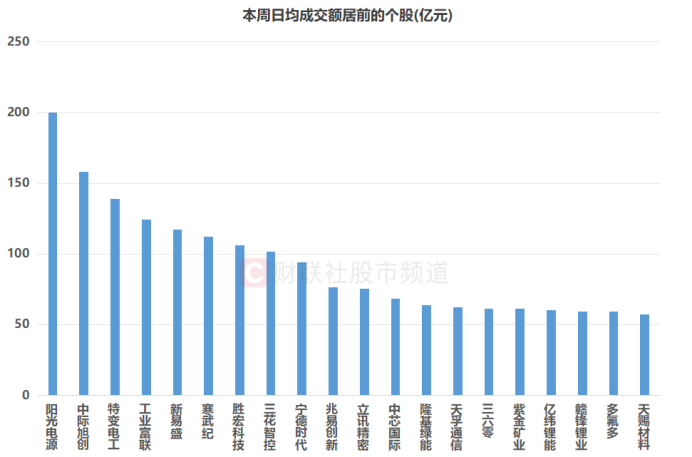 具体个股来看,本周共有29股日均成交额在50亿元以上,较上周(48股)减少近4成。其中,阳光电源、中际旭创、特变电工、工业富联、新易盛、寒武纪、胜宏科技、三花智控共8股日均成交额超100亿元。同时,宁德时代、兆易创新、立讯精密、中芯国际、隆基绿能、天孚通信、三六零、紫金矿业、亿纬锂能、赣锋锂业等股本周日均成交额也相对居前。