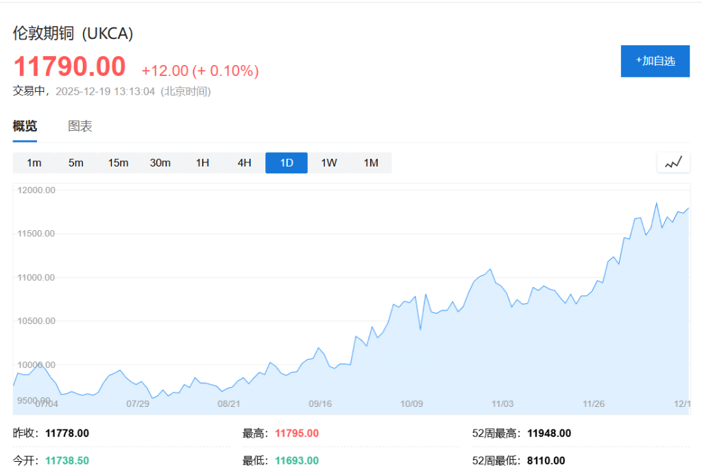 2025年以来,铜价因美国加征精炼铜关税预期和库存下降而上涨,2026年预计将维持高位盘整,全年均价约为11,400美元/吨。
