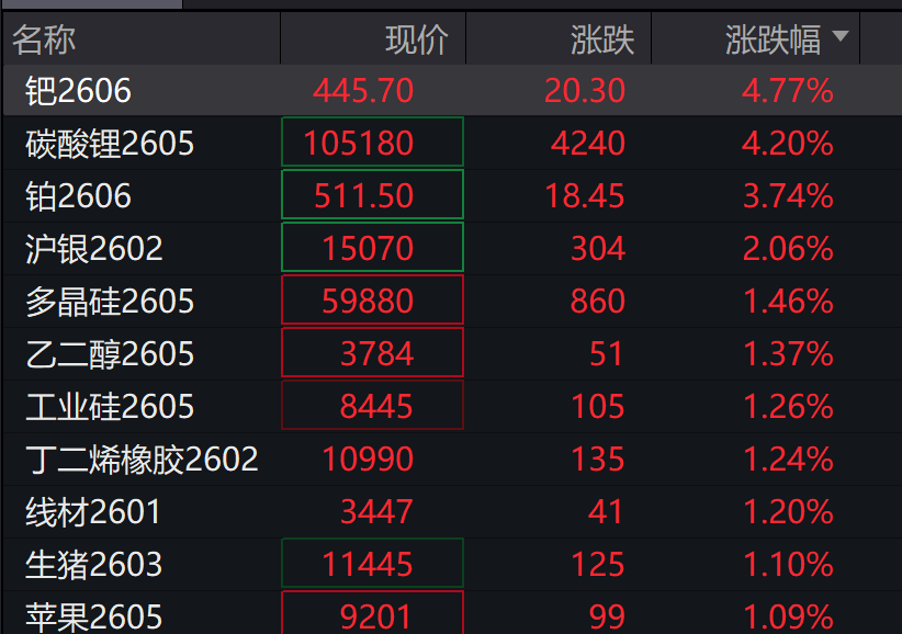 商品期货收盘,铂、钯主力合约涨停,碳酸锂涨超7%,沪银涨超5%,多晶硅涨超4%,沥青涨超3%。
