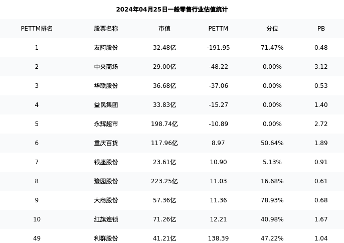 从估值角度看:利群股份最新市盈率PETTM为138.39,在行业内排名44/62,处于47.22分位。