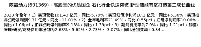 值得注意的是:2024年04月天风证券的分析师,首次发布关于陕鼓动力的研究报告,标题为:陕鼓动力(601369):高股息的优质国企 石化行业快速突破 新型储能有望打造第二成长曲线。