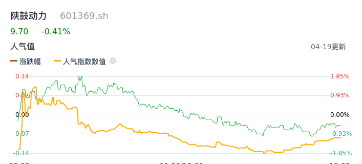 04月19日,陕鼓动力收报9.70,股价涨幅-0.41%,成交金额2.07亿元,换手率1.25%。