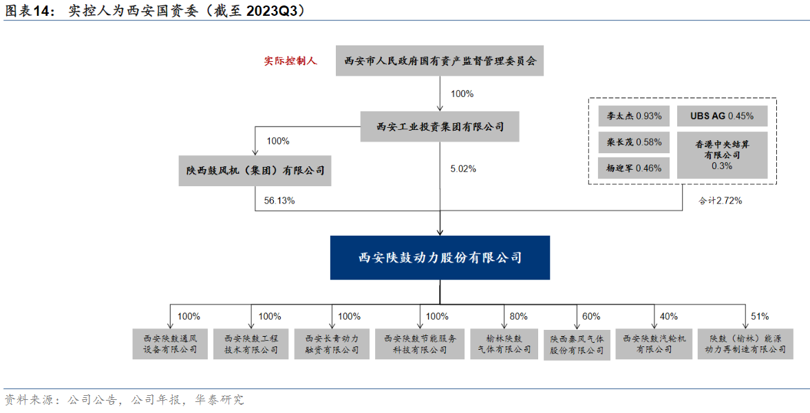 公司控股股东是陕鼓集团,实际控制人是西安市国资委。截至2023年8月,陕鼓集团持有公司56.13%,西安工业投资持有公司5.21%,公司是位于西安的优质国有企业,子公司布局覆盖设备制造、工业气体业务。