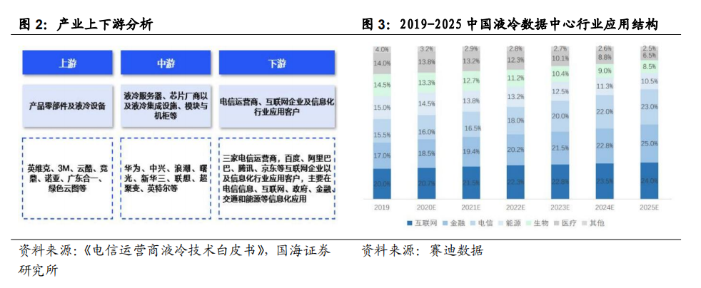 我国液冷技术起步稍晚于国外,但起步后发展迅速,后期与国外发展进程基本同步,并且在液冷规模试点应用方面积累了丰富经验。产业链方面,液冷产业生态包括上游的产品零部件提供商、中游的液冷服务器提供商及下游的算力使用者。