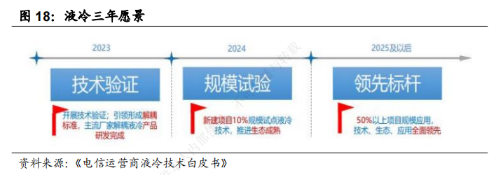 展望未来三年液冷前景,2023年液冷产业开展技术验证,充分验证液冷技术性能,储备规划、建设与维护等技术能力;2024年开展规模测试,推进液冷机柜与服务器解耦,促进竞争,推进产业生态成熟,降低全生命周期成本;至2025年,开展规模应用共同推进形成标准统一、生态完善、成本最优、规模应用的高质量发展格局。在算力和双碳提升散热等需求下,液冷优势明显,未来发展前景一片蓝海,有望形成规模化推广。