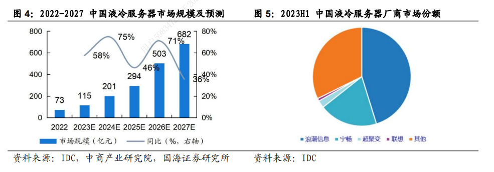 市场规模方面,2023上半年中国液冷服务器市场规模达到6.6亿美元,同比增长283.3%,预计2023年全年将达到15.1亿美元。IDC预计,2022-2027年,中国液冷服务器市场年复合增长率将达到54.7%,2027年市场规模将达到89亿美元。