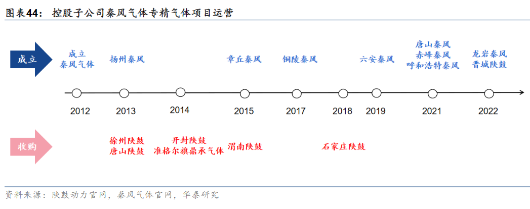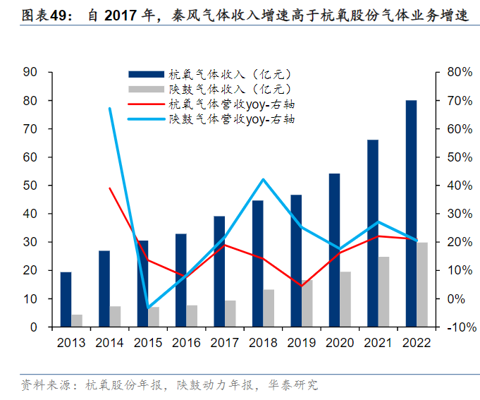 公司重要子公司秦风气体具备气体运营优势,设备切运营,工业气体业务成长空间大,从事工业气体运营主要有两方面的优势,第一是实现空分装置的自供,可以更好解决运营中设备的故障,日常的运营维护中也具备更强的优势。第二是透平机械设备与工业气体几乎都是同样的客户。