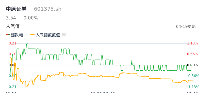 04月19日,中原证券收报3.54,股价涨幅0.00%,成交金额9327.40万元,换手率0.76%。
