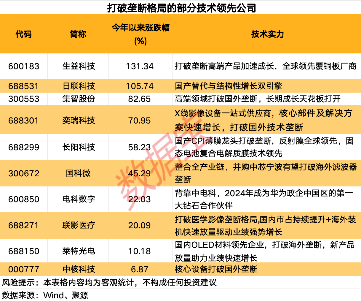 根据券商研报的研究内容,上述130家公司中,有多家公司的核心技术有望打破垄断或聚焦关键产业,据数据宝不完全梳理,这一类公司共有奕瑞科技、莱特光电、长阳科技等10家。