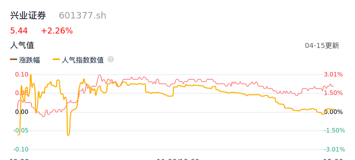 04月15日,兴业证券收报5.44,股价涨幅2.26%,成交金额2.84亿元,换手率0.61%。