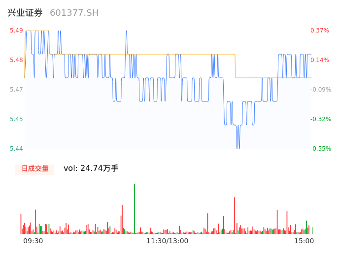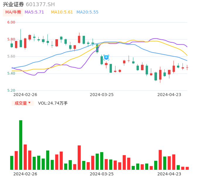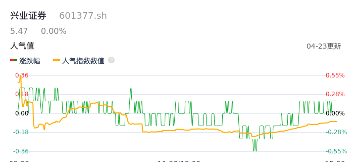04月23日,兴业证券收报5.47,股价涨幅0.00%,成交金额1.35亿元,换手率0.29%。