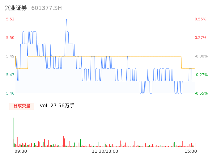 04月19日,兴业证券收报5.47,股价涨幅-0.36%,成交金额1.51亿元,换手率0.32%。