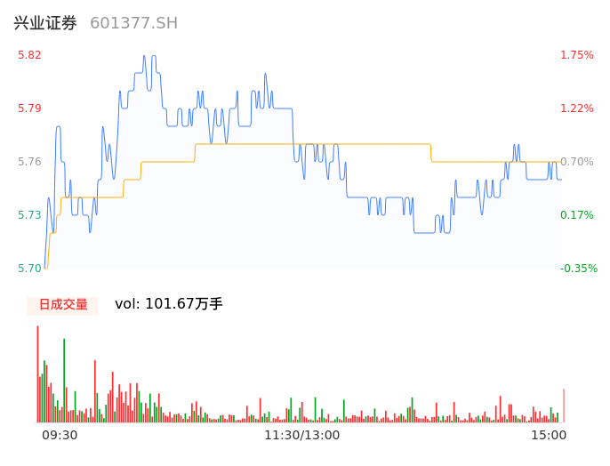 04月29日,兴业证券收报5.75,股价涨幅0.52%,成交金额5.86亿元,换手率1.18%。