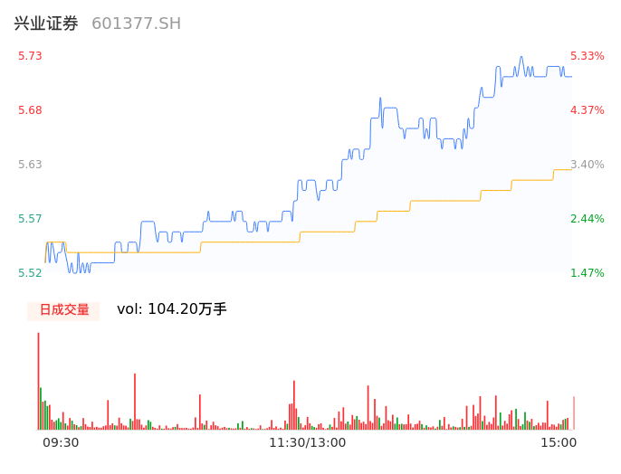 04月26日,兴业证券收报5.72,股价涨幅5.15%,成交金额5.85亿元,换手率1.21%。