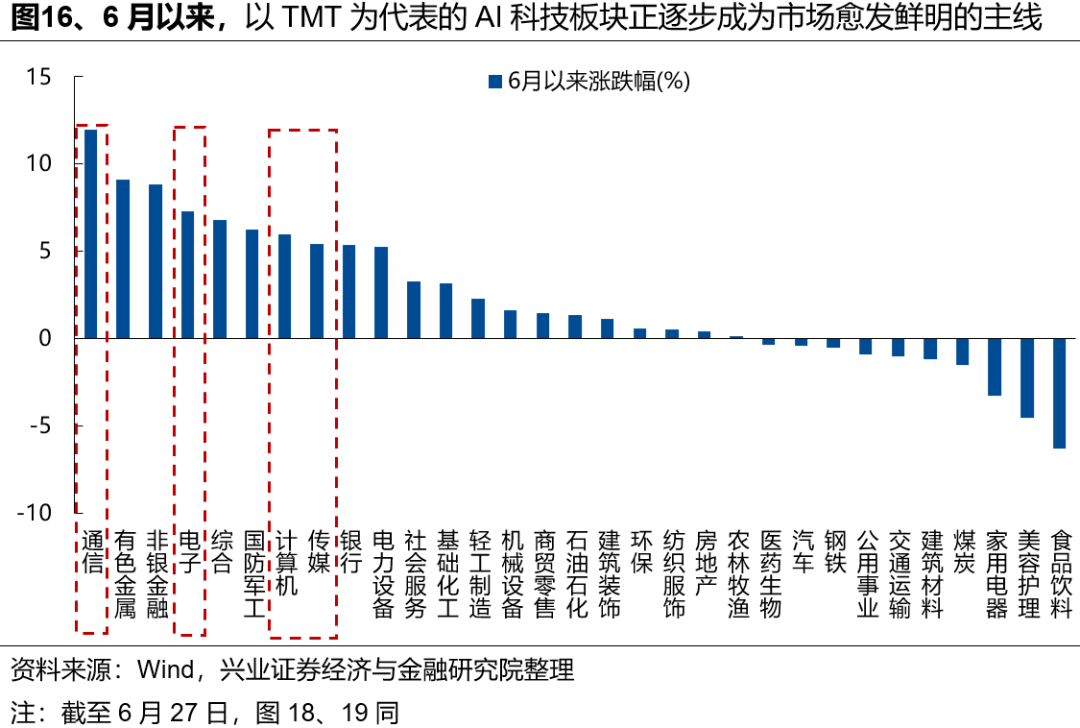 6月以来,基于股价位置、产业催化等各个维度反复提示AI等科技板块的修复。近期来看,以TMT为代表的AI科技板块不断修复、正逐步成为市场愈发鲜明的主线,并成为本轮市场新高的重要推动。