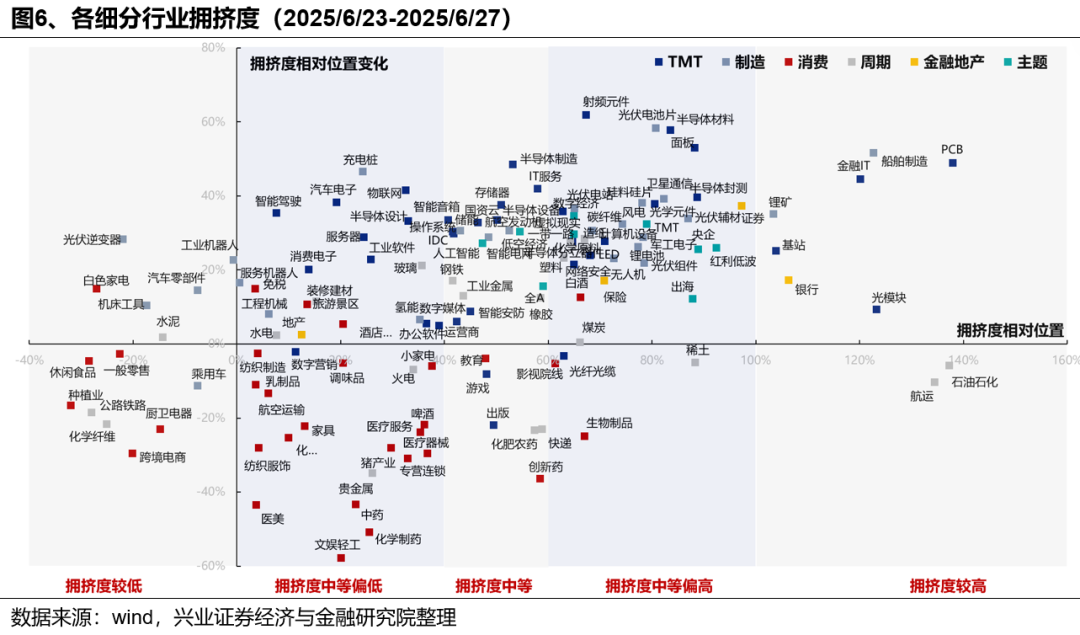 拥挤度看,当前多数行业拥挤度仍处于历史中等甚至偏低水平,包括部分TMT、制造、资源品、以及消费板块。