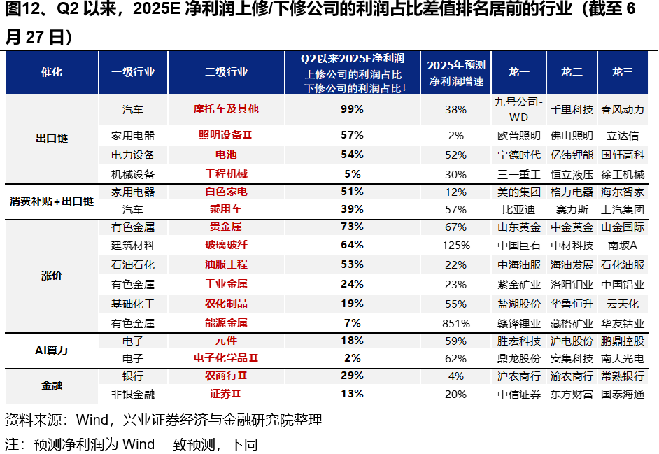 筛选二季度以来各行业盈利预期的调整变化,中报业绩有望改善的方向主要集中在部分出口链、涨价链、AI和金融等领域,包括: