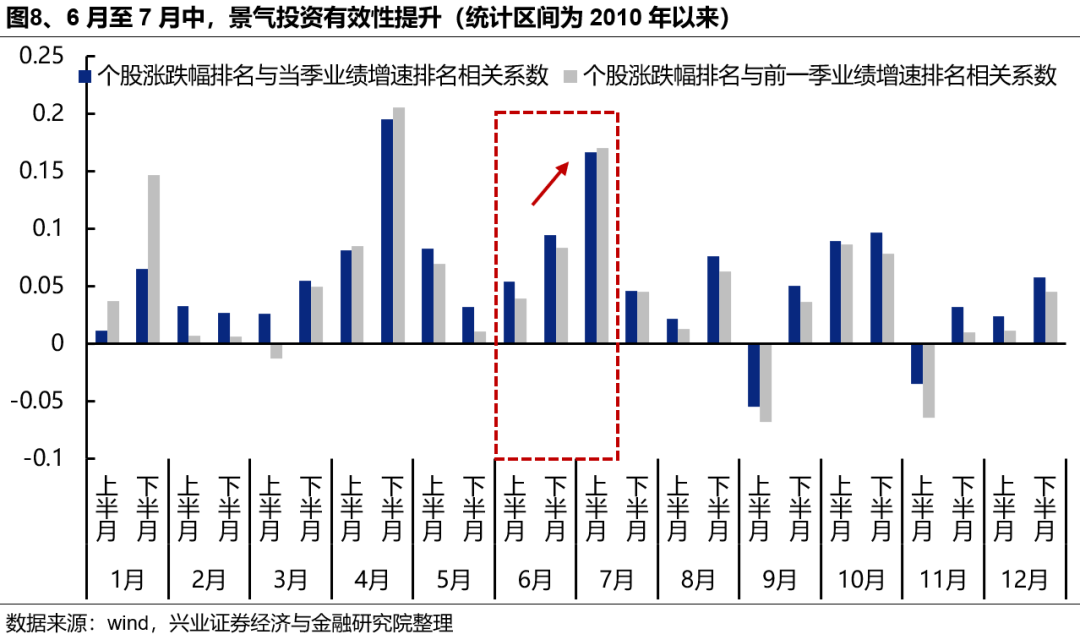 随着中报业绩预告陆续披露,7月是全年最看业绩的月份之一,市场将更加注重交易现实,关注基本面的兑现,景气投资或更加有效。统计了全年各个月份市场涨跌幅排名与业绩增速排名的相关性,可以看到,随着中报业绩预告陆续披露,6月至7月中景气投资的有效性提升,7月上半月市场对当期业绩的关注程度仅次于4月下半月(年报&一季报)。未来一段时间,业绩或将再度成为超额收益的胜负手。