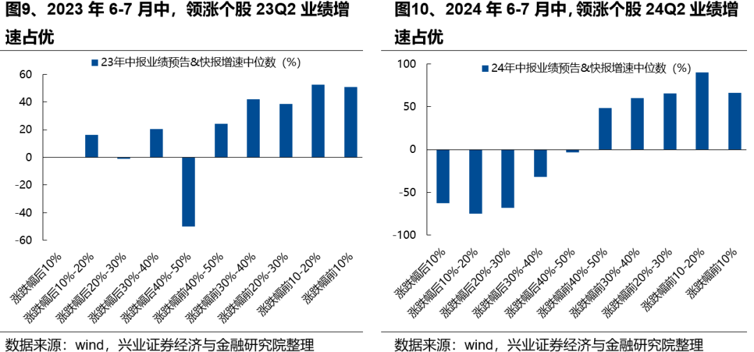 从个股表现来看,中报预告、快报陆续发布期,业绩对于个股表现的影响十分显著。过去两年,6-7月中领涨的个股大多具备更高的中报业绩预告&快报增速,未来一段时间具备自下而上挖掘alpha的市场环境。