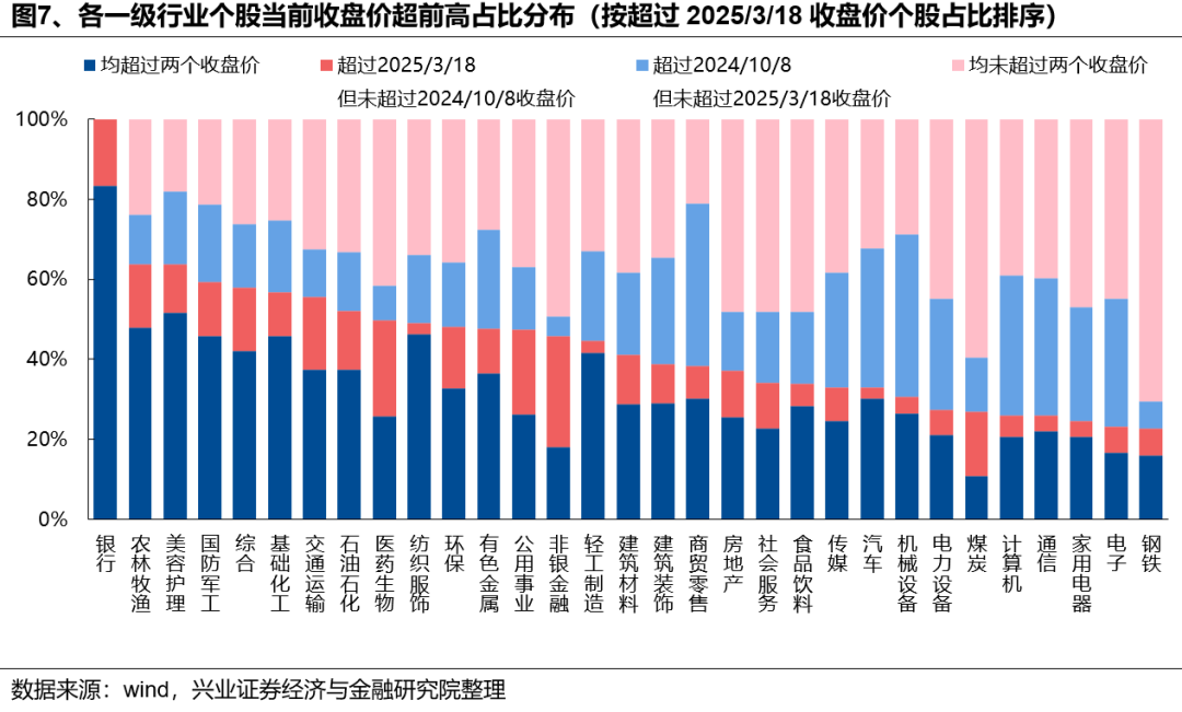 各行业股价分布看,本轮上证综指新高主要由银行贡献,各行业分化依然较为明显,尤其是TMT、新能源、机械、汽车等科技成长板块中仍有大量个股收盘价未突破3/18前高。