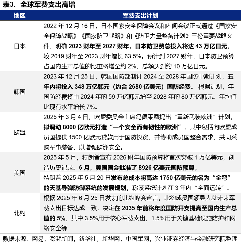 对外,当前世界面临百年未有之大变局,全球军备竞赛拉开帷幕。随着我国武器在世界持续展现强大竞争力,中国在国际军贸中的市场空间有望进一步打开。2月以来,特朗普政府关税战升级,印巴、中东等全球地缘政治紧张局势加剧,各国政府均在提高对国家安全的重视程度,全球军备竞赛序幕正在拉开。随着去年末我国六代机亮相、3月我国军舰绕澳大利亚环行展示,到二季度的台海联合演练、歼10CE在印巴冲突中大放光彩,中国武器持续展现全球竞争力。地缘冲突背景下国家安全牵引长期军贸需求,中国在国际军贸中的市场空间有望进一步打开。