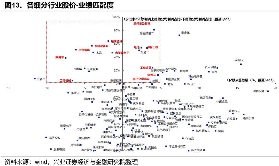 根据股价-业绩匹配度,筛选其中的低位绩优方向,主要包括出口链(摩托车、照明设备、电池、乘用车、工程机械、白电)、涨价链(玻璃玻纤、工业金属)、电子(元件、电子化学品)、券商等。