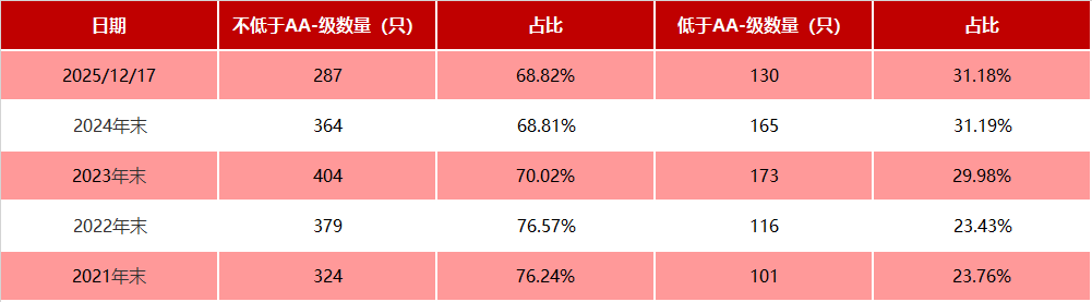 不过,需要注意的是,近年来,随着优质银行转债的批量退出,存量转债信用评级整体呈现弱化趋势。Wind数据显示,截至12月17日,评级低于AA-级转债的数量有130只,占比31.18%,而转债发行数量较高的2021年和2022年,该比例分别为23.76%和23.43%。