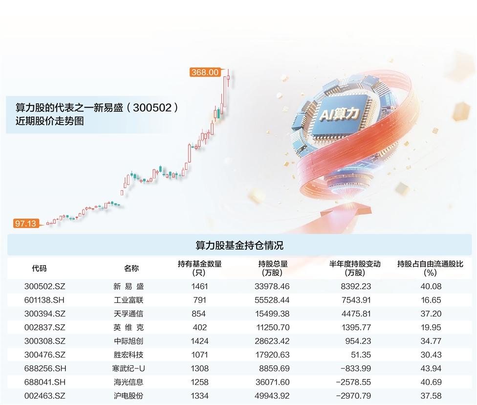 最新的半年报数据显示,截至2025年二季度末,全市场有约1500只基金持有光模块龙头新易盛,持股数量3.34亿股,占到新易盛自由流通股比例的40%;而国产算力龙头寒武纪背后站着超1300只基金,持股占到自由流通股比例高达44%。