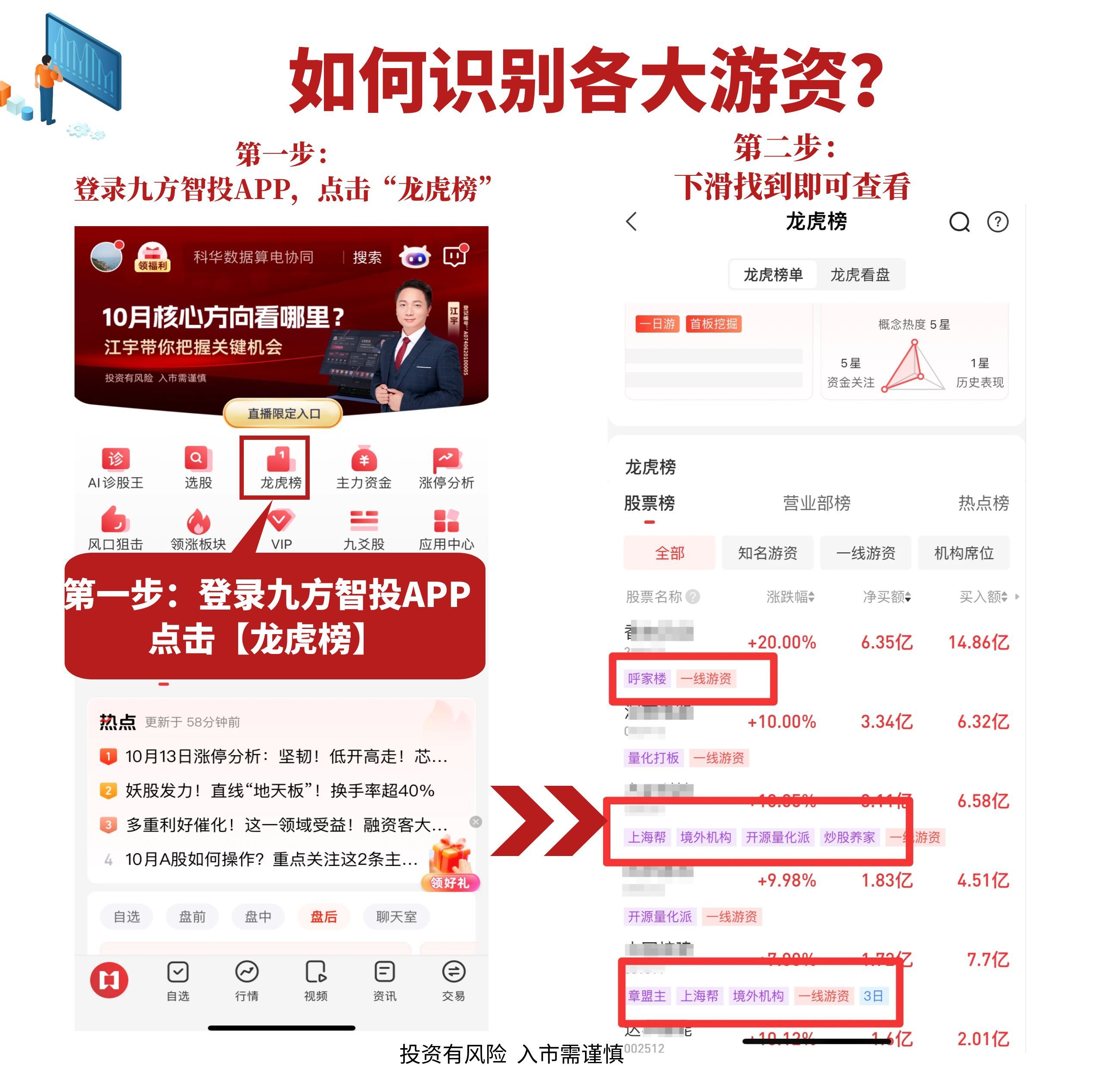 这么多游资,席位那么多,我怎么能分的清楚呢?小编再大家分享一个简单的方法,通过九方智投APP识别各大游资。