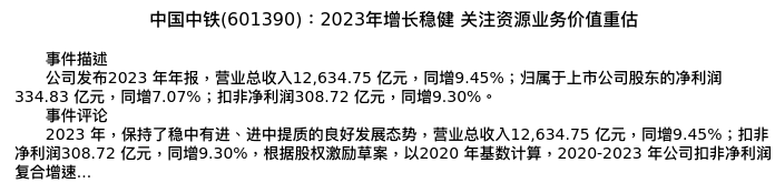 值得注意的是:2024年04月长江证券的张弛/张智杰/张韦华/袁志芃分析师,首次发布关于中国中铁的研究报告,标题为:中国中铁(601390):2023年增长稳健 关注资源业务价值重估。