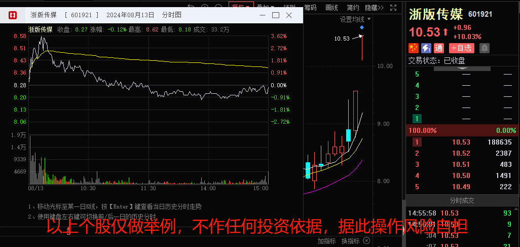第一种买点:买在有量下的分歧,8月19日,当日开盘浙版传媒放量急速拉升,这里就是做数据预期的资金进场,在出现急剧放量的情况下,游资进来点火,从龙虎榜数据上也能够看出来,只要有量,才是游资进场的时候(游资喜欢一次性把筹码买够)。但盘面中也可以看到,在前文提到的“有能力去研究数据的人”的潜伏盘大批出货,最终冲高回落,也是最后一次分歧。