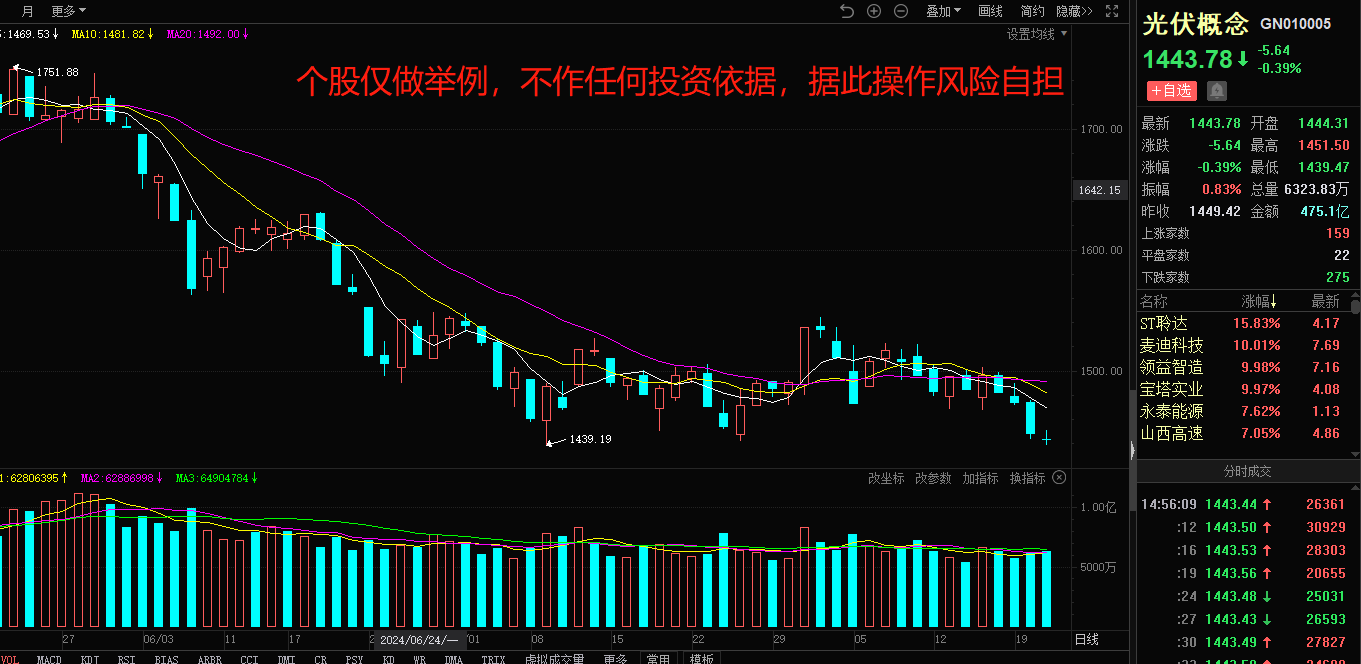 板块的资金容量不能过大,例如光伏,资金容量太大,即使走出行情,也是一两年的事情,虽然近期也有利好消息催化,但大都是冲高套人,最近是缩量行情,活跃资金很少,撑不起太大的板块上涨。预计板块的核心中军成交量在50亿左右,比较合适(参考航天科技、大众交通的最大成交量),再多市场即会承接不住。