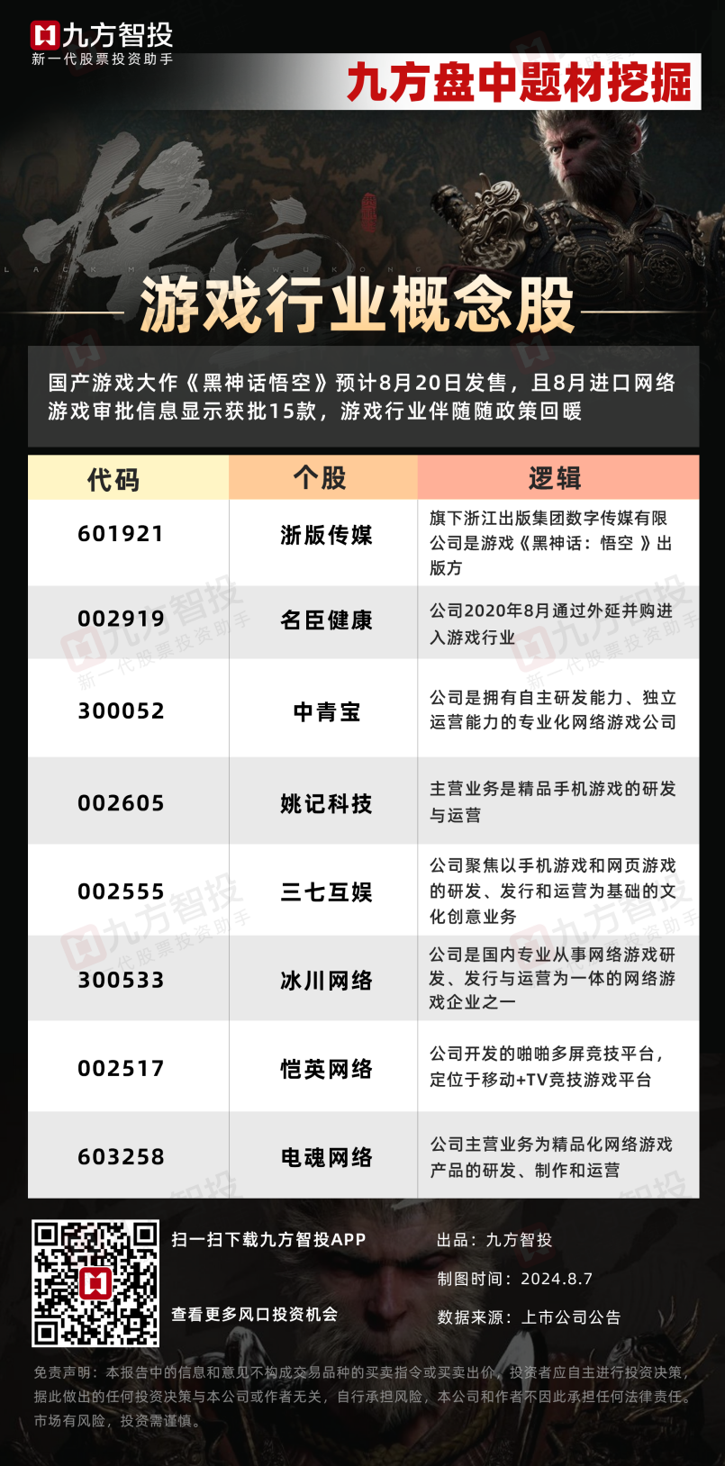 《黑神话:悟空》是国内第一款3A大作,且售卖数据非常超预期,意义非常,是开创性的,很可能带动单机游戏的出圈(类比于原神),出现全新的炒作方向。虽然今日走势出现分歧,但后续反复炒作的预期很大。需要注意的是:需要看资金的选择方向,游戏研发、相关受益方、周边衍生品、旅游概念,都有可能。