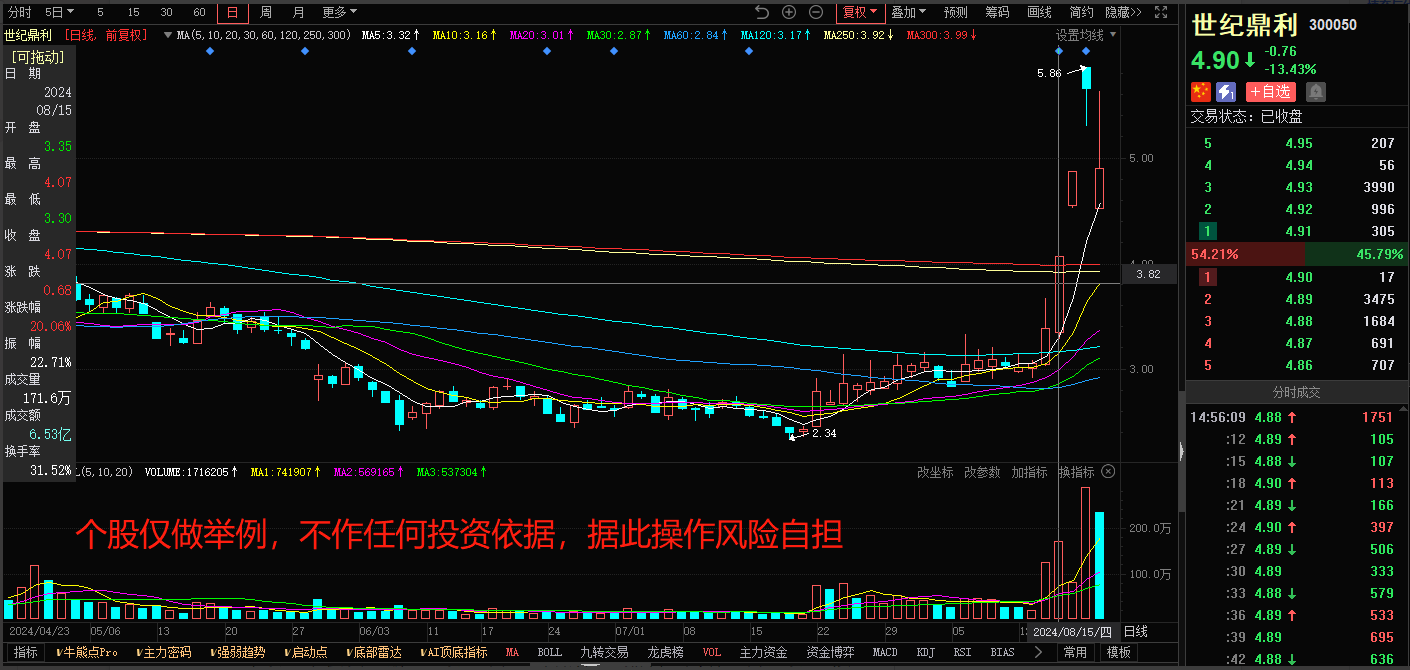 为了让大家了解的更清楚,我们依然以最近的行情为例——华为海思概念,8月20号出现了明显的退潮,毫无疑问最先启动的就是世纪鼎利,8月14日就有资金传言海思将要独立出去,资金借着消息启动,随后2个交易日直接加速,到8月19日,按照普通投资者,早上一字板开盘,是不是还是很兴奋,但是实际上题材的退潮已来
