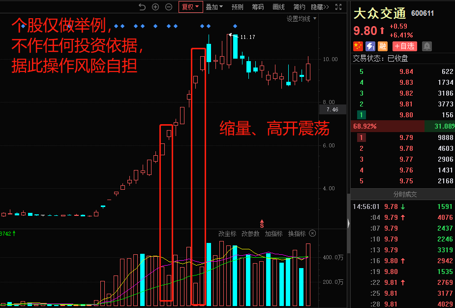 因博士眼镜行情较短,未出现缩量,所以拿大众交通的两段行情举例,前一日分歧,后一日缩量高开、高位换手后上板,都是分歧转一致的典型表现,大家可以对照捷荣技术、圣龙股份、艾艾精工等前期板块龙头股对照着找一找这里的买点,这样印象会比较深。