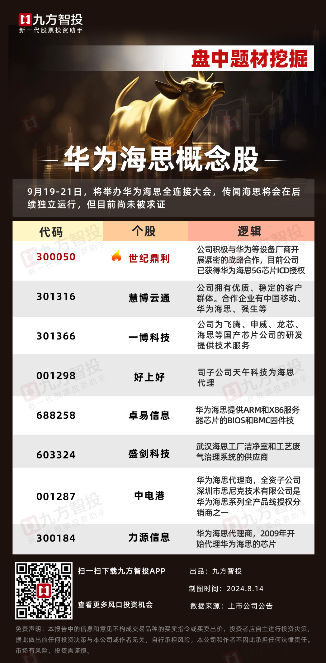 近期的消息催化为华为海思全联接大会将于9月9日在深圳举行,时间上还有一定空间(参考商业航天,在火箭发射前炒了半个月左右),全连接大会涉及到星闪,虽然华为星闪也已经是炒过的题材,但作为套利的话确定性还是比较高的,且华为概念整体已经持续了一段时间,资金介入比较深,有望继续走出行情。