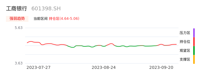 我们来看一下该股的九方特色指标强弱趋势的情况:工商银行自09月13日从观望区上穿到持仓区。股价近期在多头区域持续强势上扬,上升动能仍较为充足,可积极关注。后续重点关注上方压力位:5.06元是否能突破上攻。
