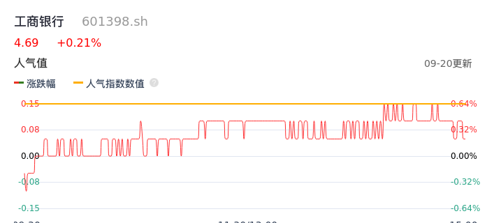 09月20日,工商银行收报4.69,股价涨幅0.21%,成交金额13.35亿元,换手率0.11%。