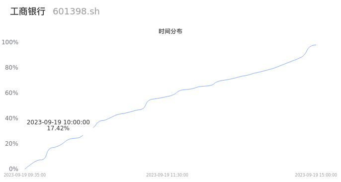 601398工商银行2023年09月19日成交206.61万手,成交金额9.64亿元,相较昨日放量40.49万手,换手率0.08%,成交清淡。