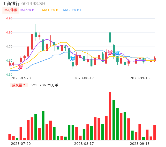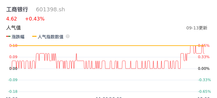 09月13日,工商银行收报4.62,股价涨幅0.43%,成交金额9.51亿元,换手率0.08%。