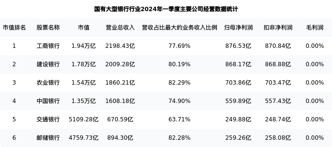 工商银行最新报告期数据为一季度,下表汇总了国有大型银行行业内市值靠前的公司一季度主要经营数据