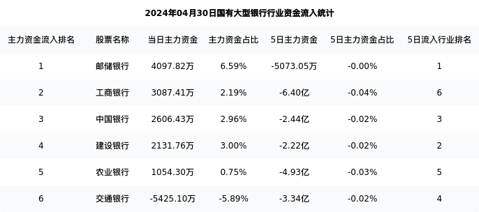 工商银行今日净流入3087.41万元,主力占比2.19%,在行业内排名:2/6;5日净流出6.40亿元,主力占比0.04%,在行业内排名:6/6。