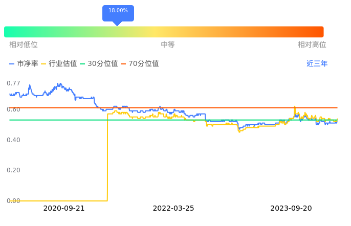 工商银行当前市净率PB为0.54,在所属的国有大型银行中,市净率PB排2,前五名分别为交通银行市净率0.51、工商银行市净率0.54、中国银行市净率0.54、农业银行市净率0.57、建设银行市净率0.58。工商银行当前市净率PB为0.52,超过近3年18.00%的历史数据。
